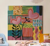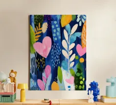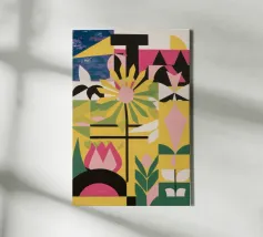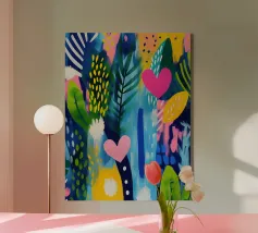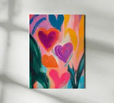 Een vrolijk en hartverwarmend patchwork van gestileerde planten, levendige patronen en een groot, liefdevol hart. Dit eclectische kunstwerk is een vreugdevolle viering van liefde, groei en handgemaakte schoonheid.