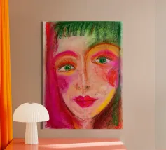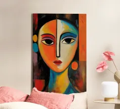 Levendig oranje, geel en azuur smelten samen in gebroken vlakken over een evenwichtig gezicht, alsof het licht zelf de gelaatstrekken opnieuw beeldhouwt. Elke penseelstreek pulseert met elektrisch leven, waarbij een balans wordt gevonden tussen precieze anatomie en uitbundige chromatische abstractie. Het portret straalt vertrouwen en nieuwsgierigheid uit, en daagt kijkers uit om schoonheid waar te nemen buiten de voorspelbare paletten. Het is afgedrukt in archiefkwaliteit op dik mat papier en vormt een gedurfd middelpunt voor creatieve studio's, gangen of moderne lounges. Het herinnert iedereen die het ziet eraan dat kunst de werkelijkheid kan breken in een duizelingwekkend nieuw spectrum.