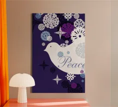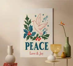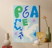 Moderne illustratie met vredige symboliek: een witte duif met een olijftak symboliseert hoop, harmonie en vertrouwen. De speelse typografie, zachte blauwe tinten en decoratieve vormen geven de poster een kalme, positieve uitstraling. Ideaal voor woonkamers, slaapkamers of meditatieruimtes - perfect voor iedereen die verlangt naar evenwicht en innerlijke rust. Eigentijdse illustratie in een moderne kunststijl met spirituele lichtheid.