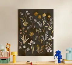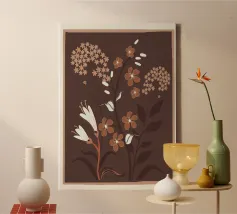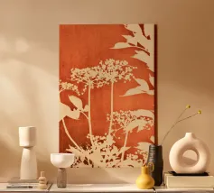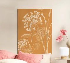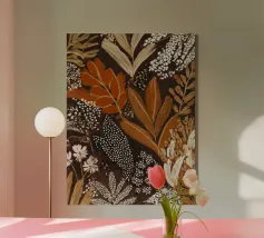 "Rust Meadow" gloeit met de warmte van het herfstlicht, waar sienna, oker en zacht ivoorkleurige plantensoorten oprijzen uit diepe aardetinten. De gelaagde penseelvoering roept de stille poëzie op van velden in de schemering, waarbij organische details samensmelten met moderne abstractie. Een studie naar diepte, warmte en natuurlijke gratie.