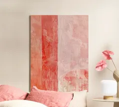 Deze abstracte compositie is opgebouwd rond een zachte spanning tussen gedurfd koraalrood en verzachte blosjes, onderbroken door een lichtgevende witte passage. De kleuren ontmoeten elkaar en overlappen elkaar in brede, schilderachtige blokken, waardoor een gevoel van structuur ontstaat zonder rigiditeit. Het palet blijft warm en samenhangend, waarbij het wit fungeert als een rustige adem in het kleurenveld.