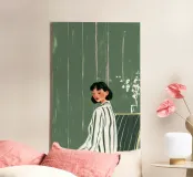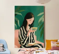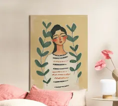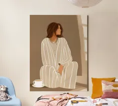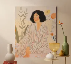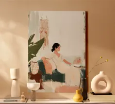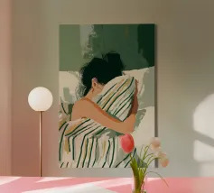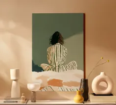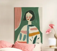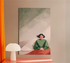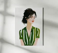 Dit eigentijdse portret vangt een moment van stille introspectie door middel van zachte schildertexturen en een ingetogen kleurenpalet. De vrouwelijke figuur, weergegeven in zachte penseelstreken en subtiele contrasten, komt tevoorschijn uit gelaagde groene tinten die kalmte en emotionele diepte oproepen. Verticale strepen en delicate accenten voegen ritme en sfeer toe, terwijl de ontspannen pose kwetsbaarheid en zelfbewustzijn suggereert. Dit kunstwerk balanceert tussen figuratieve helderheid en expressieve abstractie en is ideaal voor moderne interieurs, redactionele illustraties of fine art prints die stilte, vrouwelijkheid en refl