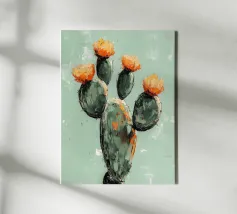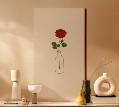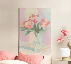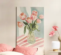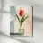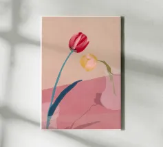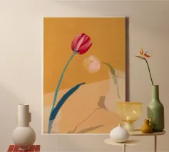 Een zachte, elegante illustratie van een rode en oranje tulp, delicaat geplaatst in een glas water. De pasteltinten van de achtergrond zorgen voor een verfijnde, poëtische toets. Een ideale muurhanger voor een rustgevend, minimalistisch bloemenontwerp.