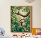 Een vrolijk jungletafereel met twee schattige aapjes die op een schommel zitten die aan een boomtak hangt. Perfect voor kinderkamers of interieurs met een junglethema, brengt speelse energie en weelderig groen naar elke muur.