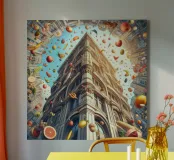 Een grillige weergave van een historisch gebouw met ingewikkelde details omringd door een levendige lucht vol zwevende vruchten en groenten. De surrealistische compositie mengt architectuur en fantasie voor een creatief, kleurrijk beeld.