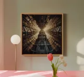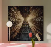 Een surrealistische voorstelling van torenhoge, symmetrische architecturale structuren die samenkomen in de richting van een gloeiend centraal licht. De ingewikkelde ontwerpen, warme verlichting en het dramatische perspectief creëren een ontzagwekkend en buitenaards beeld.