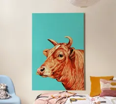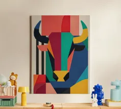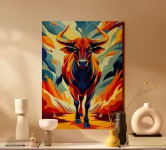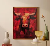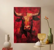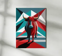 A commanding abstract portrayal of a bull’s head, constructed from layered planes, distressed textures, and intense tonal depth. Set against a powerful red field, the form feels monumental and symbolic, evoking strength, resolve, and raw presence. Fragmented surfaces and collage-like detailing add complexity, giving the piece a sense of history and weight beneath its bold exterior.