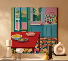 A vibrant patchwork kitchen with yellow table, tea set, and art bursts with domestic color.