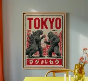 Een tongue-in-cheek deconstructie van popculturele horrormythen: in de stijl van een handgedrukte linoleumsnede combineert het werk de retro-esthetiek van oude Japanse B-filmposters met de rustieke charme van de Amerikaanse houtsnijtraditie. Godzilla en King Kong, de titanen van de vernietiging, zijn hier niet in gevecht, maar in een absurde, gemoedelijke pose, proostend met rode kopjes. De ruwe textuur en opvallende lijnen geven het beeld energie. Een gedurfd, humoristisch statement voor verzamelaars die houden van grafische kracht met een popculturele twist.