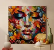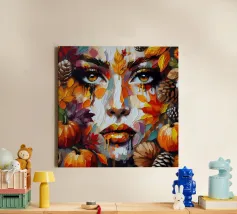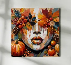 Acrylschilderij van het gezicht van een vrouw tijdens de herfst. Met bladeren, pompoen, eikels en bessen.