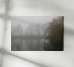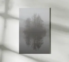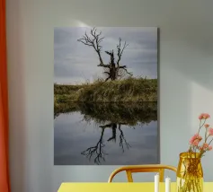 Het water beneden weerspiegelt de boom perfect en vangt elk blad en elke kromming in een zachte, glinsterende weerspiegeling. Het oppervlak is kalm, als glas, en vervaagt de grens tussen de werkelijkheid en zijn gespiegelde tweelingbroer. Terwijl het licht zachtjes over het tafereel beweegt, lijkt de weerspiegeling mee te bewegen - een stille dans van natuur en water, schoonheid en balans.