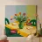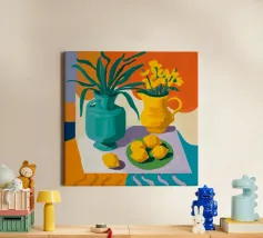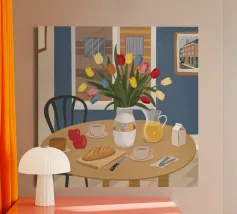 Een vredige interieurscène van een keukentafel met een vaas oranje tulpen. Gesneden fruit en schalen zijn netjes gerangschikt op het gele tafelkleed, gezien vanuit een hoek die een rustige, zonovergoten middag suggereert.
