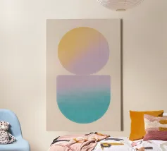 Dit moderne kunstwerk combineert heldere vormen met zachte kleurovergangen in abrikoos, rosé en petrolblauw. De minimalistische compositie met twee halfronde vlakken creëert rust, evenwicht en stijlvolle esthetiek. Perfect voor moderne interieurs, Scandinavische interieurs en iedereen die houdt van rustige muurkunst met een kleuraccent.