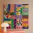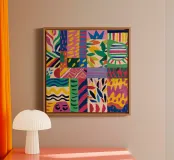 Een levendig en vrolijk patchwork van verschillende abstracte patronen en kleuren, waaronder bloemen, strepen en geometrische vormen, waardoor een levendig en energiek textielachtig ontwerp ontstaat.
