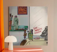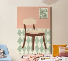 Een humoristische badkamerposter in zachte pastelkleuren met de vrolijke tekst "Ga zitten" nodigt uit tot een glimlach op het gastentoilet. Met minimalistische graphics en toiletpapier en handgetekende elementen creëert het een leuke sfeer en geeft het een duidelijke boodschap tegen opstaan om te plassen!