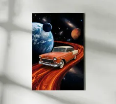 Dit surrealistische kunstwerk vangt een dromerig moment van nieuwsgierigheid en verbeelding als een kind met een astronautenhelm voor een gloeiend raam staat, starend naar een sterrenhemel waar een mysterieuze UFO verschijnt. Het warme licht van de kamer contrasteert prachtig met de diepe kosmische nacht buiten en creëert een filmische en nostalgische sfeer. Deze print is perfect voor ruimtevaartliefhebbers, sci-fi liefhebbers en dromers van alle leeftijden en voegt inspiratie, mysterie en verhalen toe aan elk modern interieur, slaapkamer, speelkamer, kantoor of creatieve ruimte.