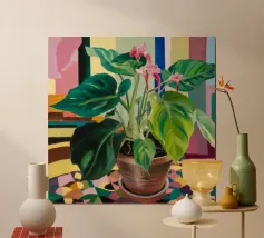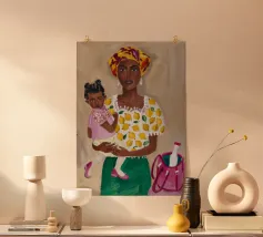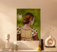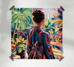 Dit kunstwerk toont een persoon die op een gestreepte stoel zit, omringd door zonnebloemen en een groene tas. De achtergrond is gedempt bruin en creëert een rustieke en reflecterende sfeer.