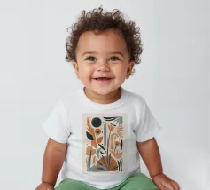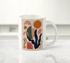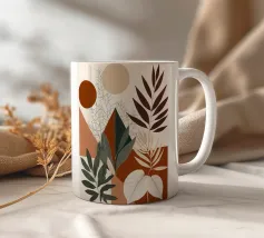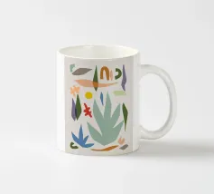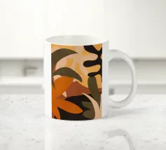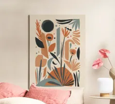 Een moderne abstracte compositie van verschillende gestileerde botanische vormen en bladeren in een palet van terracotta, beige en donkerblauw tegen een lichte achtergrond.