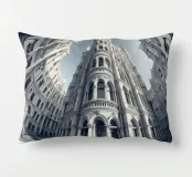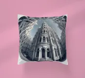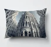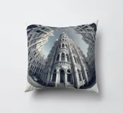 Een fascinerend zicht met een fisheye-lens op een gebouw in neoklassieke stijl, omringd door sierlijke structuren op een binnenplaats in de stad. Het vervormde perspectief benadrukt ingewikkelde details, symmetrie en de architectonische grootsheid van de scène.