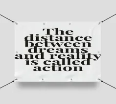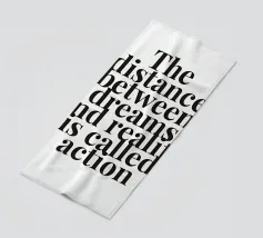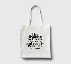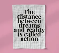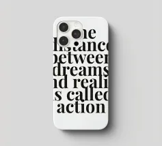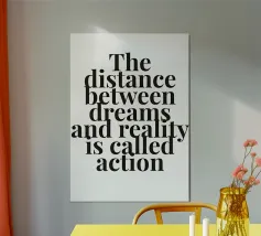 "De woorden 'De afstand tussen dromen en werkelijkheid heet actie' gerangschikt in een visueel opvallende typografische lay-out, die de kracht benadrukt van actie ondernemen om doelen te bereiken. De tekst is vet en krachtig tegen een strakke, minimalistische achtergrond, wat een gevoel van motivatie en vastberadenheid creëert.",