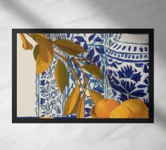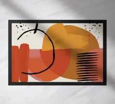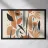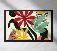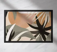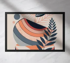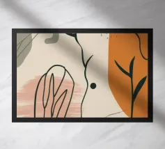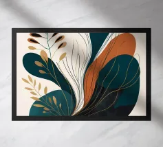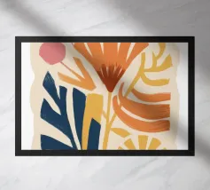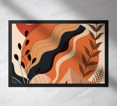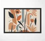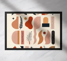 Een moderne abstracte compositie van verschillende gestileerde botanische vormen en bladeren in een palet van terracotta, beige en donkerblauw tegen een lichte achtergrond.
