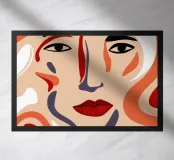 A colorful abstract portrait where facial features are defined by flowing, organic shapes and bold lines in a palette of red, orange, and beige.