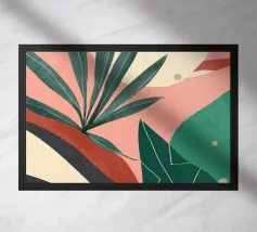 Een elegant abstract kunstwerk met overlappende bladeren en organische vormen in een verfijnd palet van groen, roze en wit, waardoor een moderne en sierlijke botanische compositie ontstaat.
