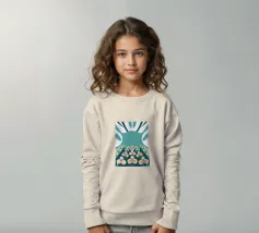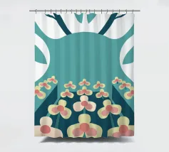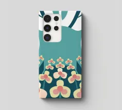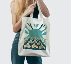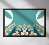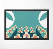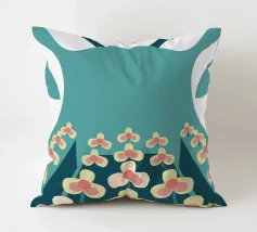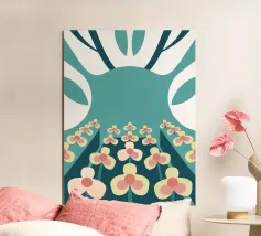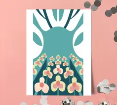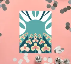 Een abstracte illustratie met een bloementuin met eenvoudige vormen en kleuren zoals groenblauw, crème en roze.