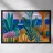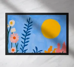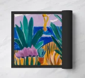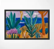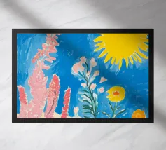 Een levendig, abstract landschap met een felle zon, palmbomen en gestileerde bloemen. De felle kleuren en moderne, grafische stijl creëren een energieke en vrolijke viering van een tropisch paradijs.