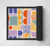 Deze afbeelding toont een kleurrijk geometrisch patroon dat verschillende abstracte vormen en lijnen combineert. Het patroon bestaat uit halve cirkels, rechthoeken, driehoeken en verticale en horizontale lijnen in een mix van zachte en gedurfde kleuren waaronder oranje, geel, lichtpaars, gedempt blauw en petrol. De repetitieve rangschikking van deze vormen creëert een speelse maar evenwichtige compositie. Het gebruik van handgetekende, ongelijke lijnen voegt een gevoel van organische stroming en artistieke textuur toe aan het gestructureerde geometrische patroon. Het algehele ontwerp