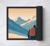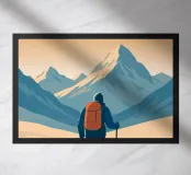 Minimalistisch reismotief of bergontwerp met een wandelaar die in de winter door de sneeuw loopt en een Alpenpanorama in de bergen van Oostenrijk. Ideaal voor iedereen die van de bergen houdt en graag wandelt, klimt, bergbeklimt of skiet.