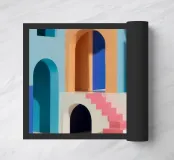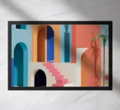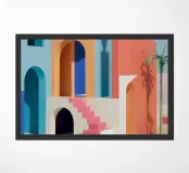 Een surrealistische architectonische compositie van bogen, trappen en deuropeningen in een zacht pastelpalet van roze, blauw en beige. Een eenzame palmboom voegt een vleugje natuur toe aan dit rustige en droomachtige labyrint.