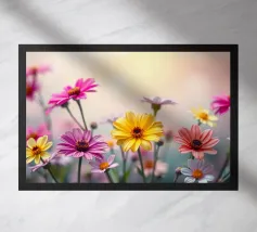 Delicate bloemblaadjes in roze, gele, rode en paarse tinten creëren een vrolijke, levendige sfeer. Weelderige groene bladeren en slanke stengels wiegen zachtjes in de wind. De lucht is gevuld met een zoete, verfrissende geur. Vlinders en bijen fladderen van bloesem naar bloesem en brengen het tafereel tot leven. Zonlicht filtert door het gebladerte en werpt een warme gloed over de hele tuin, waardoor deze aanvoelt als een vredig, betoverend toevluchtsoord.