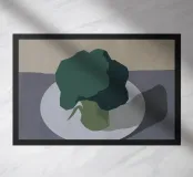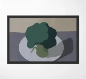 Een simplistische voorstelling van broccoli rust op een wit bord tegen een tweekleurige achtergrond met groene en grijze tinten. De abstracte stijl benadrukt geometrische vormen en vlakke kleuren.