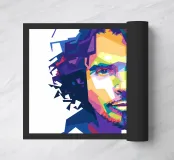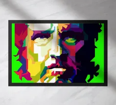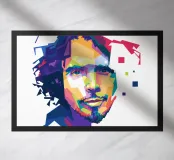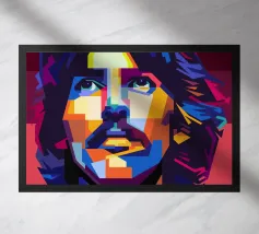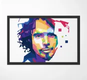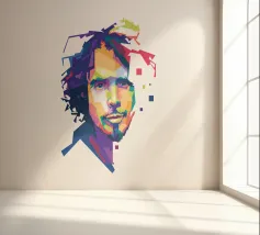 Een opvallend WPAP-portret van The Voice, de legendarische rockzanger die bekend staat om zijn krachtige stem en emotionele diepgang. Het kunstwerk is weergegeven in gedurfde geometrische vormen en levendige contrasterende kleuren. Het legt zijn intense blik en iconische aanwezigheid vast en mengt moderne pop-art energie met de rauwe geest van grunge."