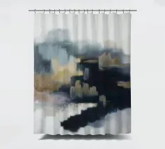 Vage donkere penseelvormen flikkeren in goud en grijs als bomen in de verte die vervagen in de mist.