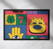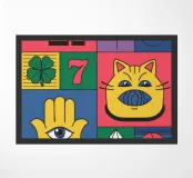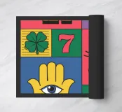 Een kleurrijk raster met verschillende gelukssymbolen en amuletten uit verschillende culturen, waaronder een olifant, een gelukskat (Maneki neko), een Hamsahand en een klavertjevier.