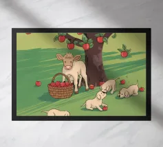 Dit schilderij toont twee katten die in een gezellige kamer genieten van een feestelijke maaltijd. De ene kat, gewikkeld in een rode deken, staart naar een bord pannenkoeken, terwijl vrolijke decoraties en hangende ornamenten het tafereel verlevendigen.