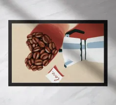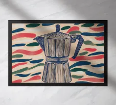 Een geometrische koffiepot wordt omringd door verspreide koffiebonen tegen een oranje achtergrond. Een groene bladplant contrasteert met de warme tinten en voegt een natuurlijk element toe aan de scène.