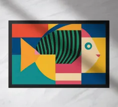 Een geometrische compositie toont een gestileerde oranje vis tegen een achtergrond van gekleurde rechthoeken en cirkels, een mix van groenblauwe, zwarte en groene tinten. Gewaagde vormen en contrasterende kleuren creëren een moderne, abstracte esthetiek.
