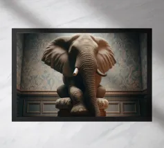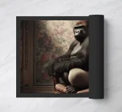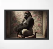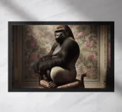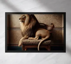A quietly arresting surreal portrait that places raw power within an unexpectedly refined setting. Seated with composed assurance, the figure occupies an elegant chair against patterned walls, blending physical presence with a sense of calm dignity. Soft, directional lighting sculpts form and texture, lending the scene a classical, almost painterly atmosphere.