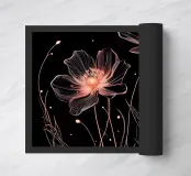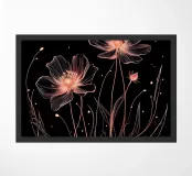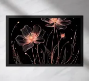 A minimalist, ethereal depiction of cosmos flowers, their delicate petals illuminated by a soft, glowing light against a dark background.
