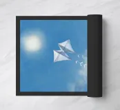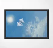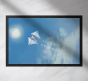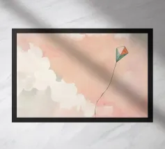 Een dromerige, met licht gevulde illustratie van twee witte vliegers die door een zachtblauwe lucht zweven, met delicate lintstaarten als ze in de buurt van de gloeiende zon zweven. Met een pastelkleurige textuur en een vredig palet vangt dit kunstwerk de essentie van vrijheid, nostalgie en stille vreugde. Perfect voor kinderkamers, luchtige woonkamers of iedereen die houdt van opbeurende, minimalistische scènes van sereniteit.