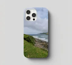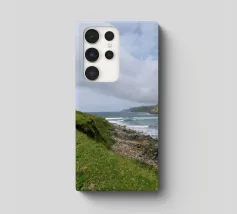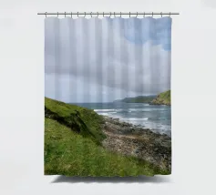 Uitzicht op een winderige kustlijn waar de ruwe zee en stenige kliffen elkaar ontmoeten en donkere wolken langs de hemel drijven. Ondanks het dramatische weer glinstert het water heldergroen, een hint naar het weelderige leven dat de Ierse natuur kenmerkt. Een typisch moment op het "Emerald Isle" - wild, ongerept en vol sfeer.
