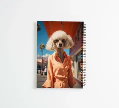 Isabelle, de witharige poedel, wandelt elegant door de straten van Palm Springs in een prachtig oranje pak. Met haar gouden zonnebril en zelfverzekerde houding belichaamt ze de geest van de tegencultuur van de Beat Generation die haar stempel op de stad heeft gedrukt, door een excentrieke levensstijl te combineren met gevoel voor mode.