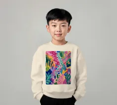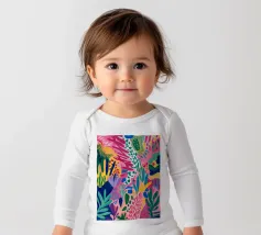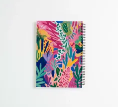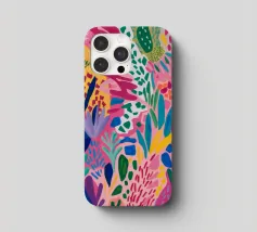 Een dicht en levendig abstract botanisch kunstwerk, gekenmerkt door overlappende, gestileerde bladvormen en intense kleurcontrasten. Overheersende tinten roze, groen, oranje en blauw creëren een visueel stimulerend en weelderig bloemenlabyrint.
