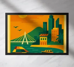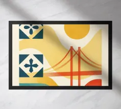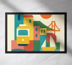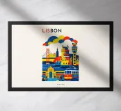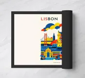 A bold, graphic celebration of Lisbon, expressed through clean geometry and vibrant colour blocking. Iconic riverside landmarks and hillside architecture are layered into a lively composition, capturing the city’s rhythm, light, and maritime character. Strong silhouettes and playful contrasts give the artwork energy while keeping the design clear and balanced.