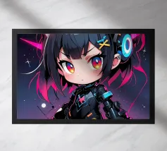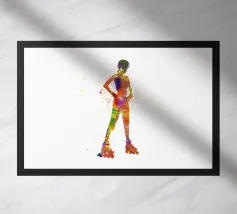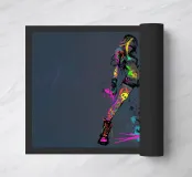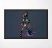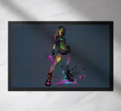 Een krachtige, eigentijdse illustratie vol attitude, beweging en kleur. Een zelfverzekerde figuur staat midden in een stap, haar silhouet steekt scherp af tegen een neutrale achtergrond, terwijl neonkleuren als rauwe energie over haar lichaam spatten. Graffitachtige tekens, spatten en symbolen doen de grens tussen mode, straatkunst en expressie vervagen en geven het werk een onrustige, uitdagende uitstraling.