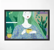 A person with long green hair is holding a yellow cup, sitting in front of a window with plants and a blue curtain.