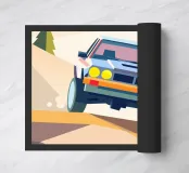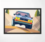 Een illustratie van een terreinwagen die in de bergen rijdt in een dynamische geometrische stijl.